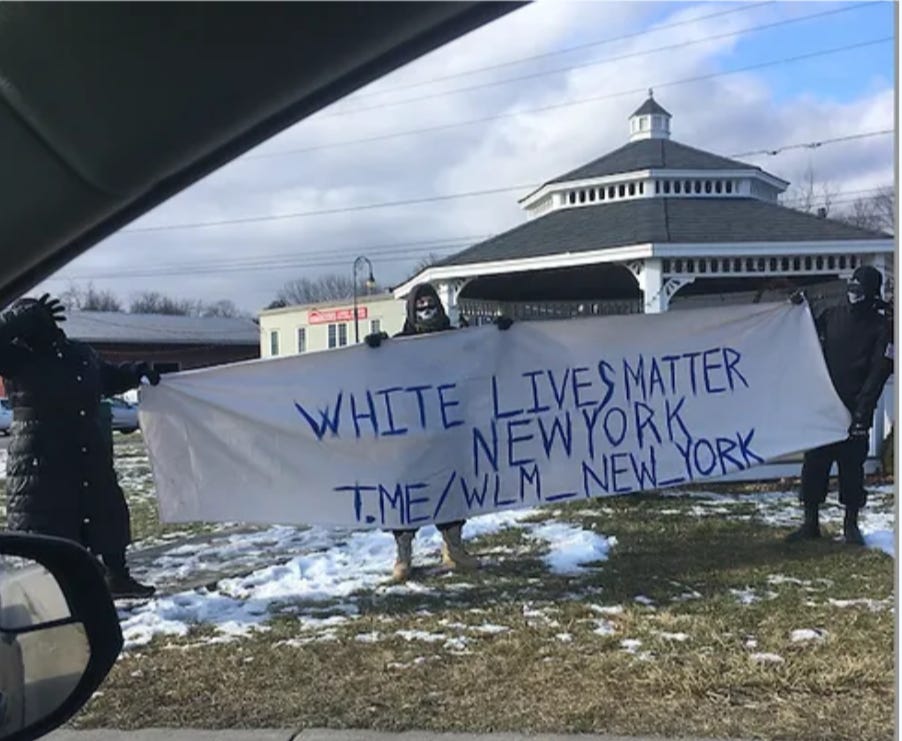 In February 2022, the activity escalated to an actual in-person demonstration held by three individuals who drove to the center of Chatham and held a banner for a few minutes on the village green. The figures concealed their identities by covering any identifying characteristics with ski masks and gloves. Their banner read “White Lives Matter New York” and their demonstration lasted only a few minutes — just long enough for video footage and photographs to be taken by one participant. Then the group piled back into their vehicle and vanished as quickly as they came.