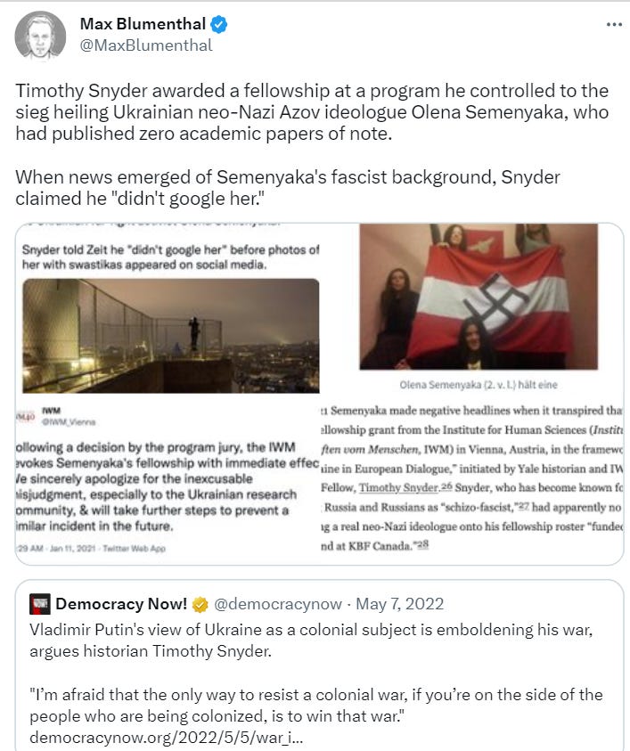 When asked by the Austrian outlet Zeit why he awarded Semenyaka a fellowship, Snyder claimed that he “didn’t google her” before photos of her posing with swastikas appeared on social media. Though IWM revoked Semanyaka’s fellowship, the neo-Nazi Azov paramilitary organization which she represented received direct training from the US and Canadian militaries.