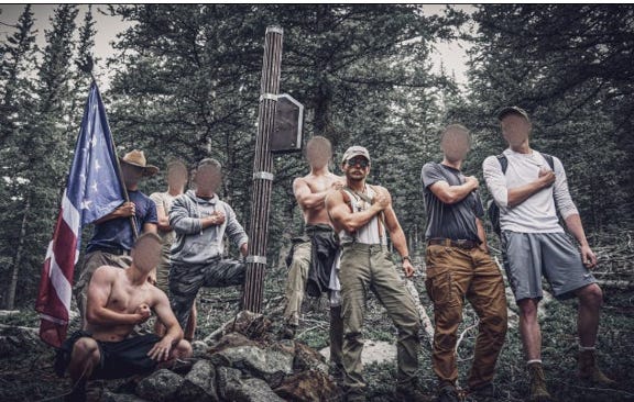 Patriot Front attempts to attract wayward male followers by promising to instill a sense of order, form, masculinity, and brotherhood through its activities. Its culture focuses on sculpting the body, sparring with fellow members, and hiking the great outdoors to revel in the land they claim was “conquered, not stolen.” Through overt use of photographic staging, filtered imagery, colors, and symbols, Patriot Front propaganda immerses followers in a world of trust, loyalty, manliness, and discipline.