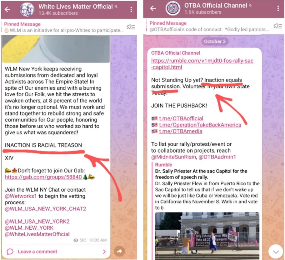 Interestingly, slogans relying on the nudge word “inaction” are similarly deployed by other online initiatives like Operation Take Back America (OTBA), which has been confirmed as an astroturf operation. The chances that these two separate groups — White Lives Matter and OTBA — could have been set up in precisely the same way with one main channel and state-level subgroups, using precisely the same propaganda techniques and even similar language is considerable.