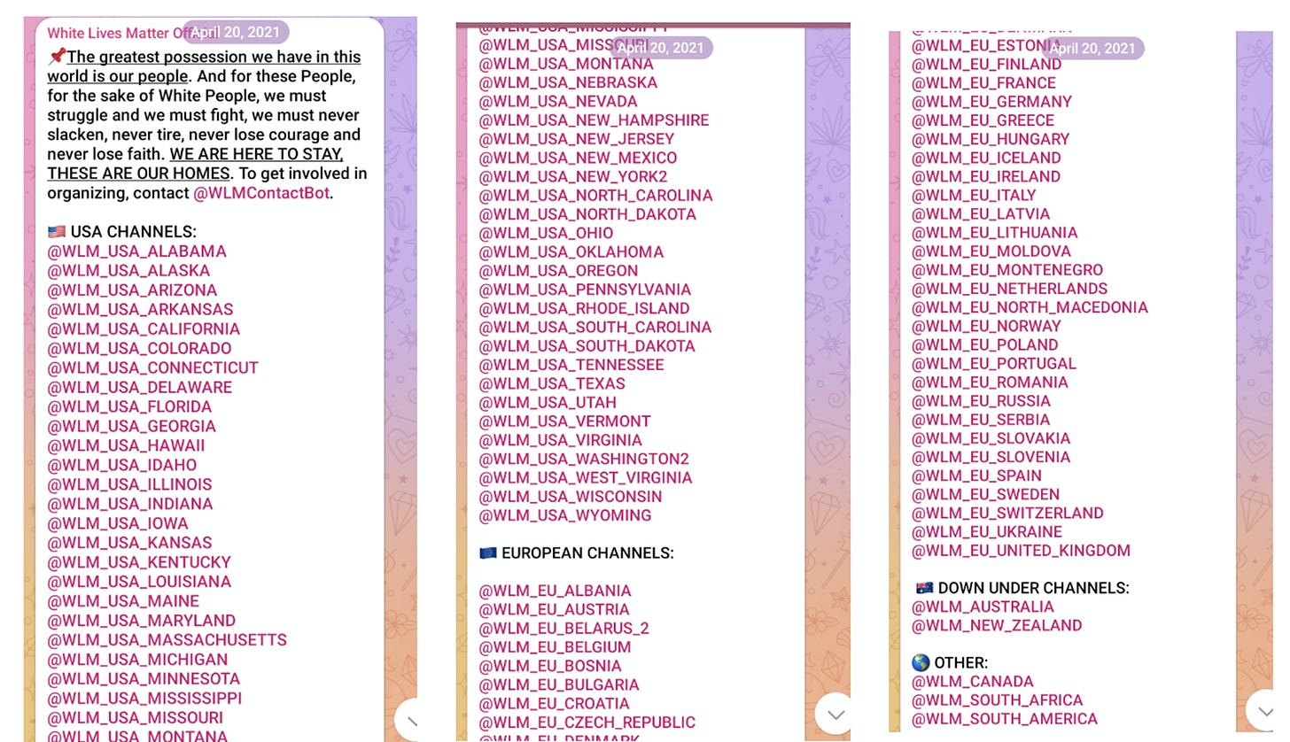 To date, the formula witnessed on WLM’s Telegram channel — one central national channel with subgroups for every state — is indicative of other highly questionable operations to recruit people into online spaces for dubious reasons.