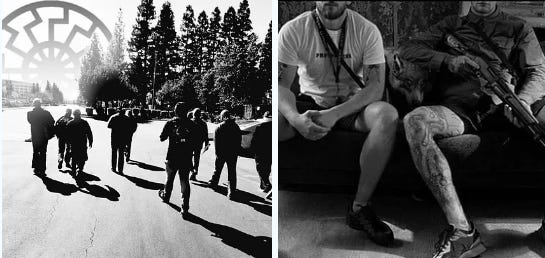 Will2Rise propaganda relies almost exclusively on black-and-white photos and videos, a dramatic visual contrast with imagery familiar to Patriot Front. The Black Sun symbol that has recently become popularized by the Azov Battalion in Ukraine is the primary symbol used by the Active Clubs. Their various social media channels invite you into a world that seeks to marry idealistic European culture with hooliganism. A favorite slogan is “cultured thug.”
